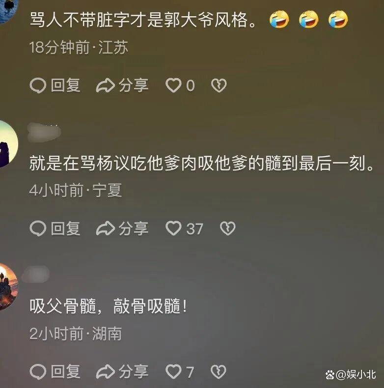 德云社演员郑好首先跳出来,直指他“劝和”只为蹭流量赚收益,还讽刺他老杨家有“见风使舵”的传承,实属下三烂。